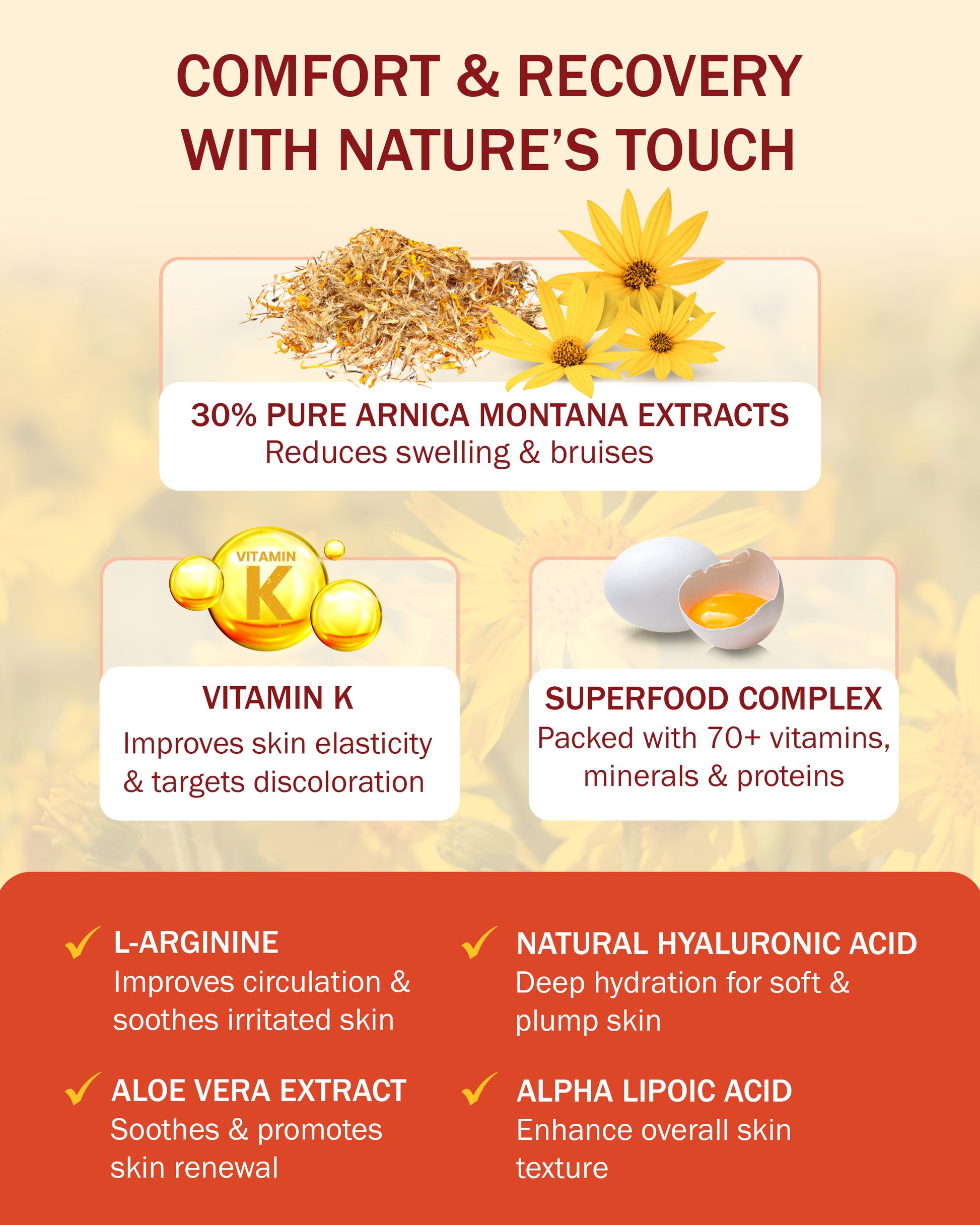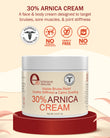 - Potent Natural Ingredients: Enriched with 30% Arnica Montana, aloe vera, hyaluronic acid, L-Arginine, and a nutrient-rich superfood complex — including Vitamins K, A, B, D, and E — this fragrance-free arnica cream for bruises supports your journey to beauty and wellness.