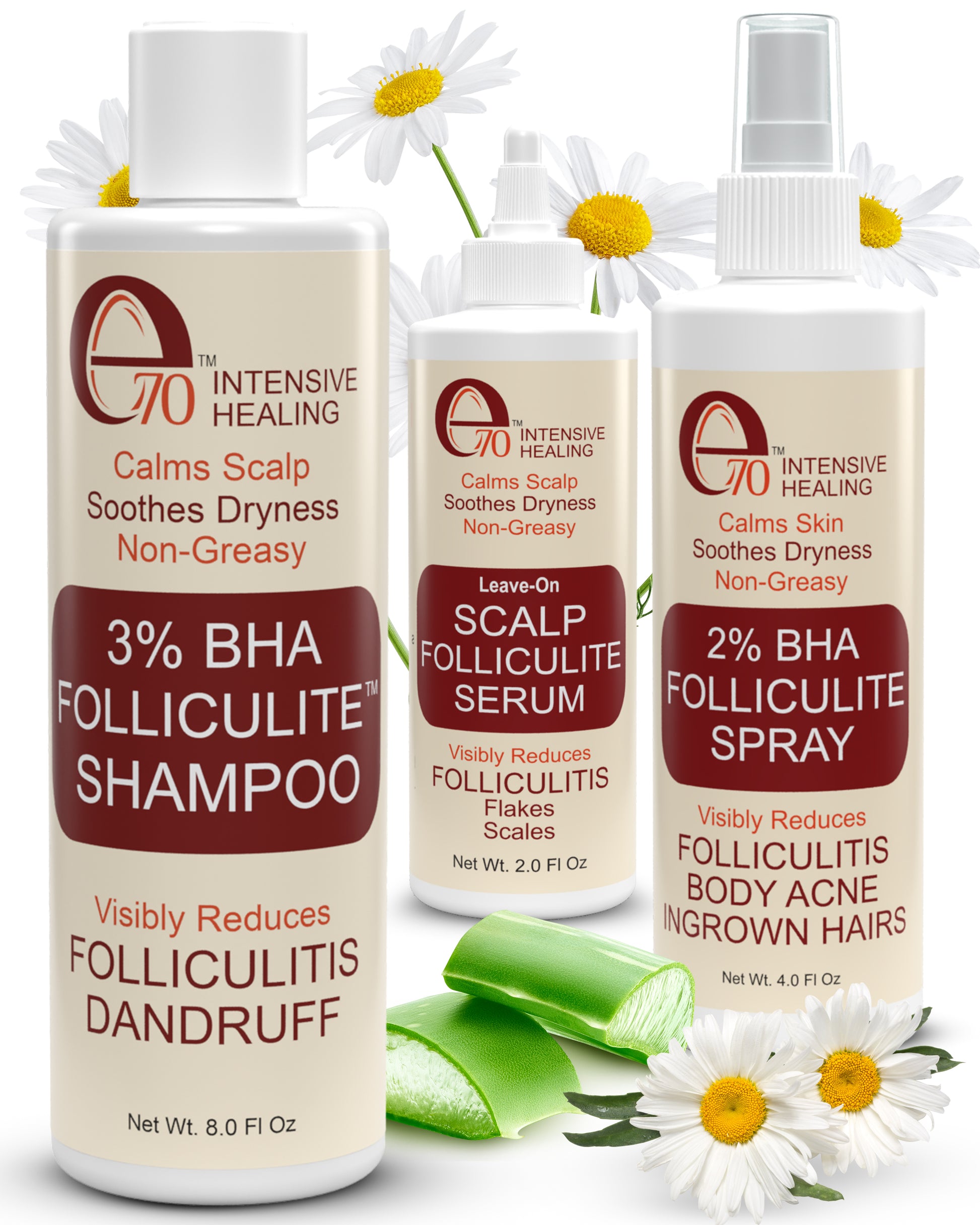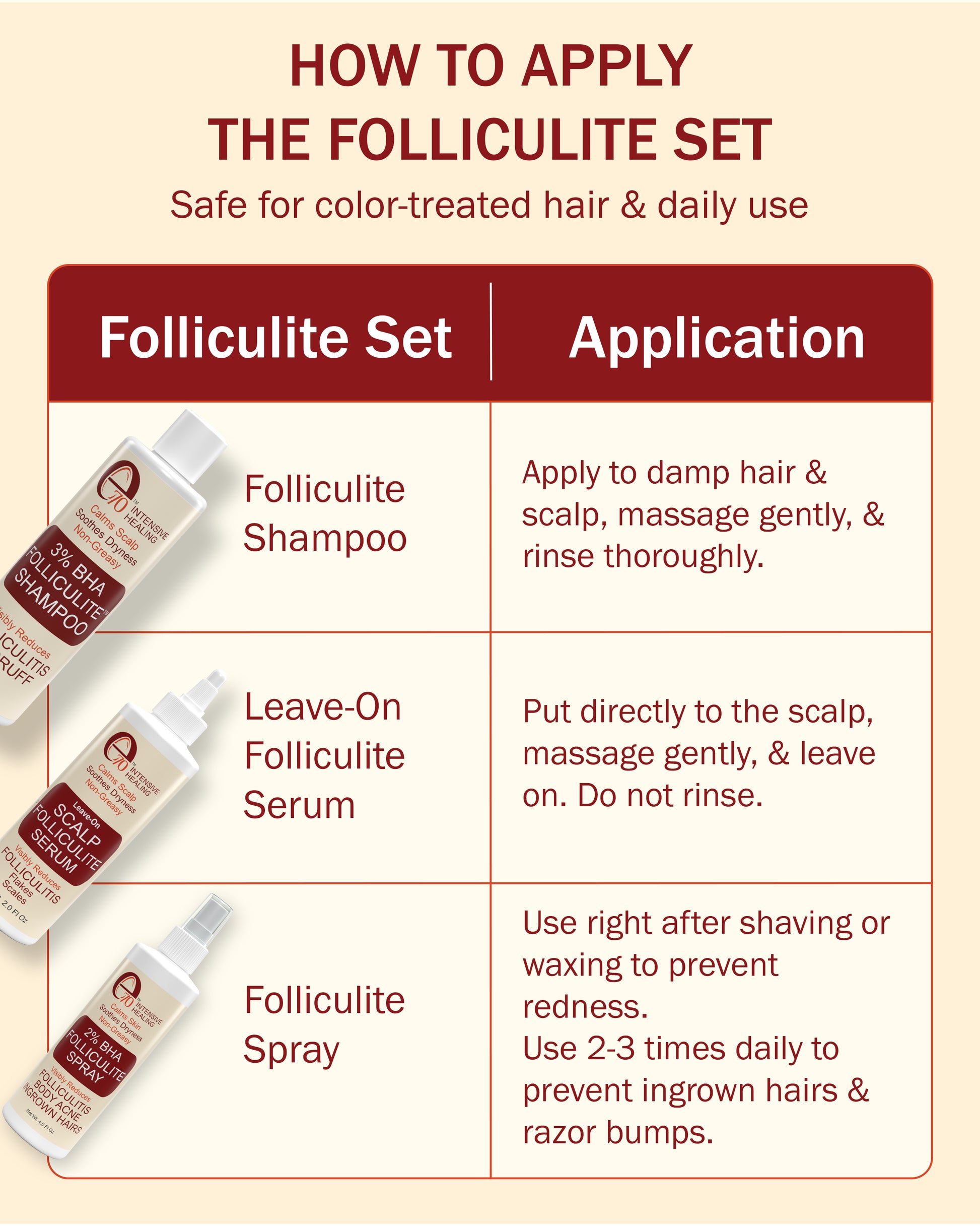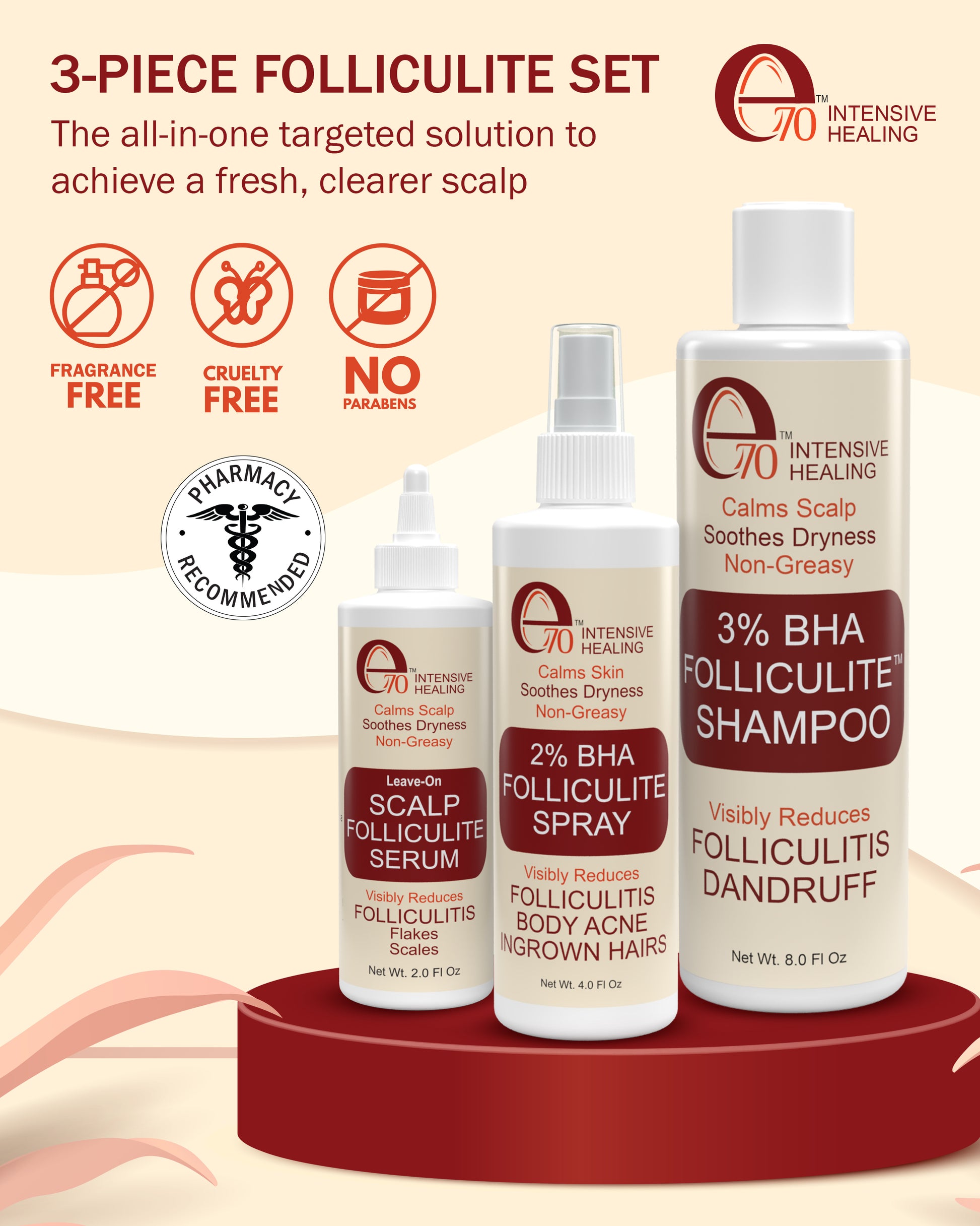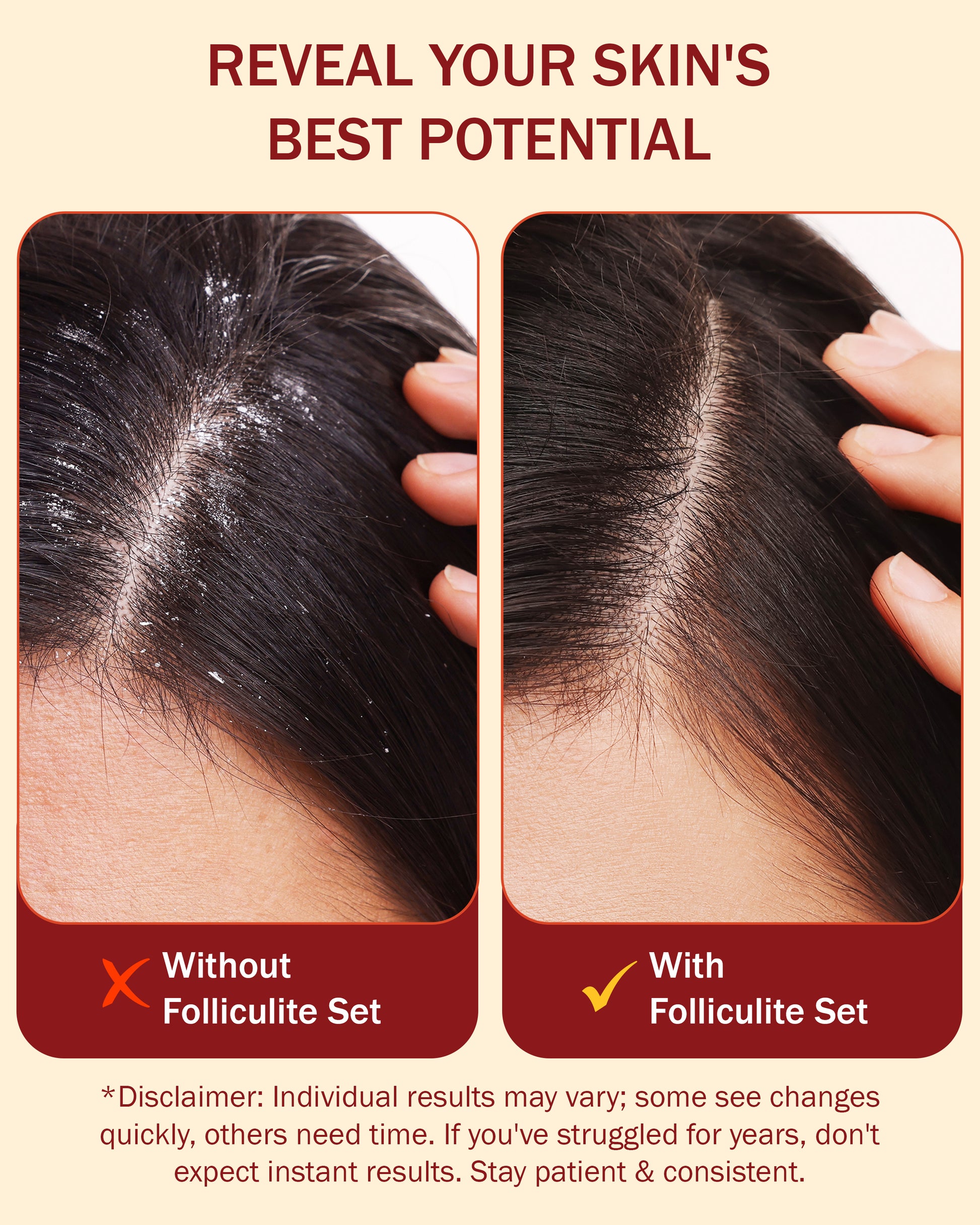Your Nourishing Care Trio: Restore moisture, soothe irritation, and achieve clearer skin and scalp with our Folliculite Set — featuring an itchy scalp shampoo, a serum for hair, and a body oil spray. Your go-to 3-piece problem-solving set for dryness, flaking, and blemishes, safe for daily use.