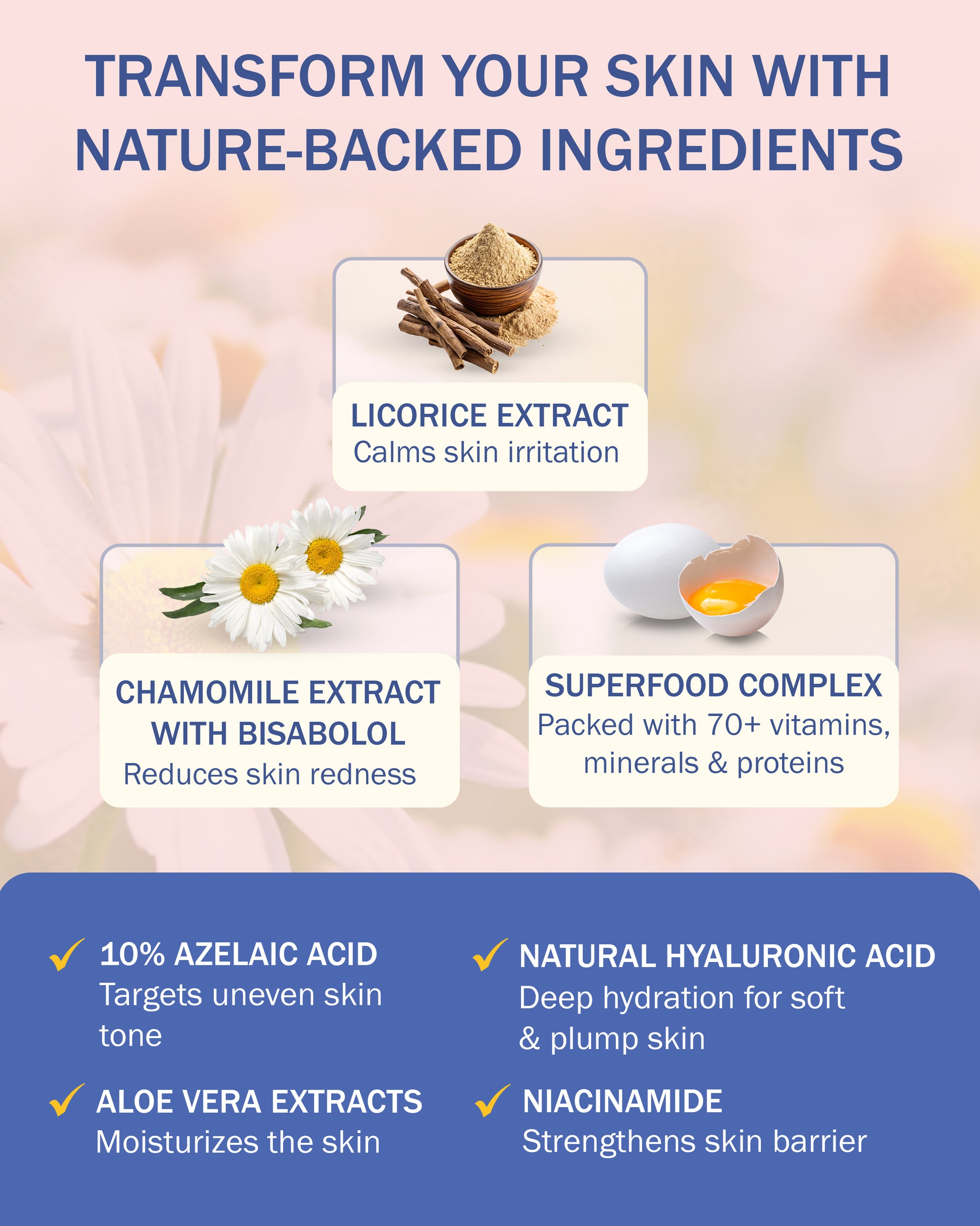 Purified Water, Aloe Barbadensis Leaf Juice, Azelaic acid, Niacinamide, Sodium Hyaluronate, Propanediol, Dimethicone,